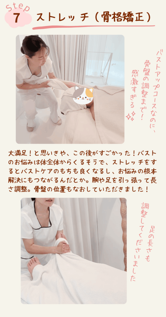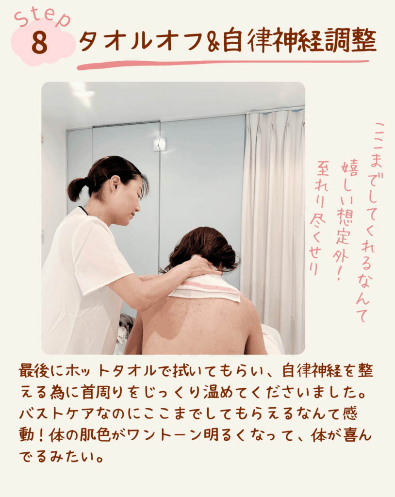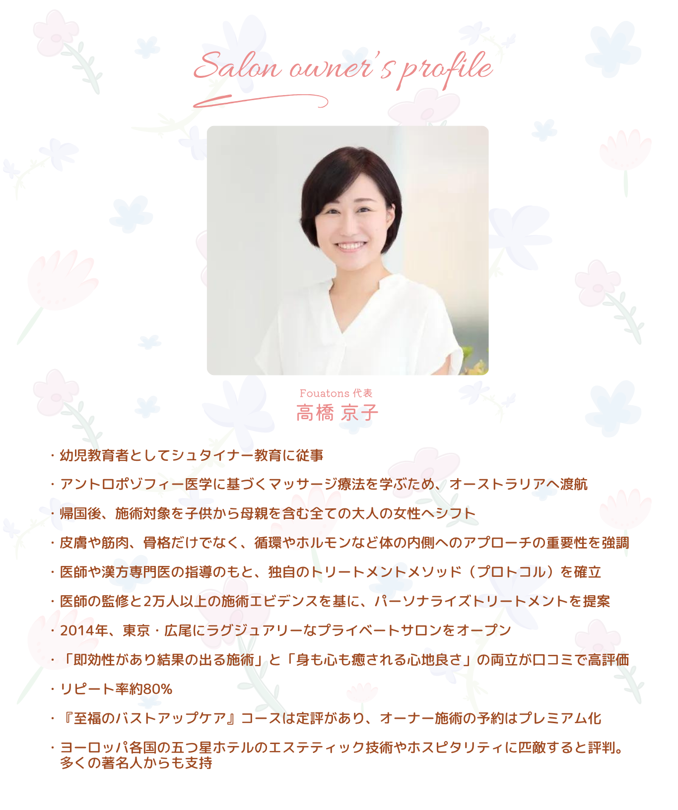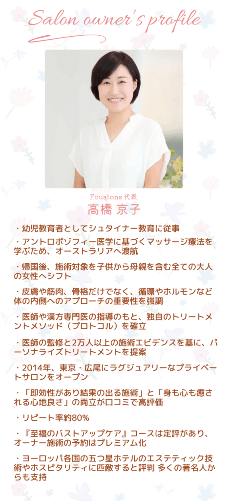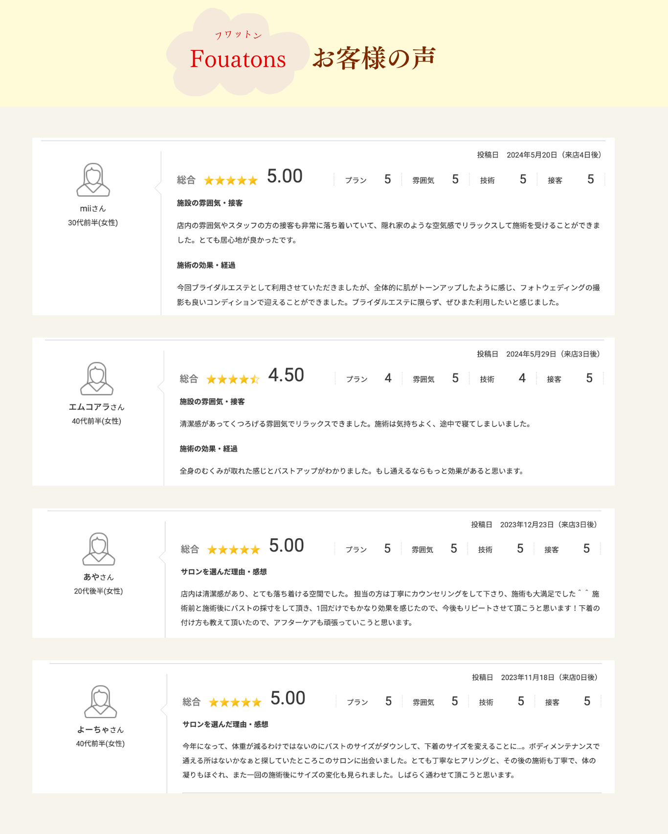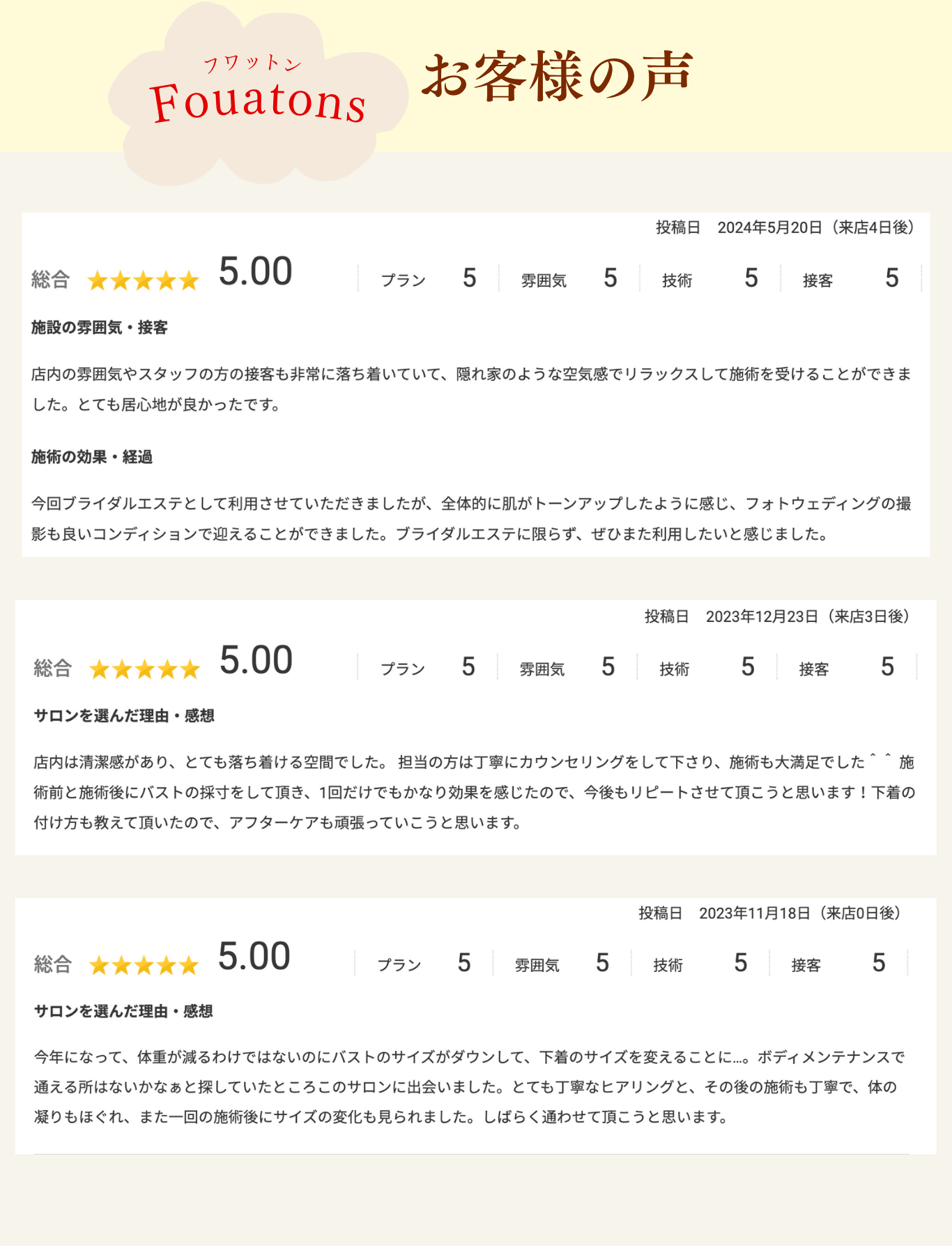 なむ2025-05-29Trustindex は、レビューの元のソースが Google であることを確認します。 初めて伺いましたが、担当の方の対応がとても優しく、緊張もすぐほぐれました。 フットバスやマッサージもずっと気持ち良くてかなり癒されました。 バストアップのコースだったので 下着のつけ方なども教わることができ、 勉強になりました。 本日はありがとうございました! Yuki F2025-04-28Trustindex は、レビューの元のソースが Google であることを確認します。 お店に入った瞬間から癒しが始まります。 オーナーの柔らかい笑顔、迎え入れる気配り、そしてお部屋の心地よさ。 施術が始まると、細胞まで届くかの如く丁寧に接してくださる。 全てが期待以上でした。 体が喜ぶのはもちろんのこと、心までほぐれて最高な時間を過ごす事ができました。 次の予約を思うだけでワクワクします。 新しい楽しみが増えました。 本当にプレシャスな時間をありがとうございました。 E I2025-04-27Trustindex は、レビューの元のソースが Google であることを確認します。 とてもリラックスできる空間で、日々の疲れが取れました!!とても丁寧で全ての施術が気持ちよかったです。 Ayako Matsushima2025-04-25Trustindex は、レビューの元のソースが Google であることを確認します。 先日、はじめてオーナーセラピストの京子さんの施術を受けさせていただき、大変感動しました。もちっとして柔らかい、温かな手からの癒しのパワーがとても素晴らしく、すっかり心身共に軽くなり浄化されました。今まで色々なエステを受けさせていただきましたが、ミシュラン級です。フェイスもきゅっと引き上げられ、若かりし頃の柔らかい肌を思い出しました。また、自分へのご褒美に伺いたいと思っております。 さくら2025-04-24Trustindex は、レビューの元のソースが Google であることを確認します。 こちらのお店に入るまで正直不安がありましたが、ここの営業の方はお客側の立場になって親身に話を聞いて下さり、安心して迅速丁寧な対応を常にして下さりました 120分コースで脚のマッサージオプションで アロマの香りと丁寧なマッサージで心身ともに癒されました☘️ 力加減の適切さもバッチリです。 痛気持ちいい部分をがっつり揉んでもらい、ゴリゴリがなくなっていくのが心地よかったです 心も身体が軽くなってポカポカしてウトウトしてました〜 お腹も肩も全身もスッキリです☺️✨ 居心地がいいサロンでした✨ ありがとうございました☺️ rika ogr2025-04-16Trustindex は、レビューの元のソースが Google であることを確認します。 夏が近づいてきたので、バストアップで検索して伺いました。施術の内容も充実していて、話しやすいエステティシャンの方で安心して悩みを相談することができました。 コンプレックスを解消するために、継続して通いたいと思います! mariko miyazaki2025-04-14Trustindex は、レビューの元のソースが Google であることを確認します。 初めてのケアだったので緊張していましたが、とっても親切でお店の空間も素敵でした。自分のご褒美にまた是非行きたいです! junko hotta2025-04-13Trustindex は、レビューの元のソースが Google であることを確認します。 プライベートな空間でとっても癒されました。綺麗な部屋で素敵な時間を過ごすことができました。自分へのご褒美の癒しに定期的に通いたいと思います。 入澤郁2025-04-13Trustindex は、レビューの元のソースが Google であることを確認します。 ホスピタリティがとてもよかったです。良いリフレッシュになりました! midori sasaki2025-04-11Trustindex は、レビューの元のソースが Google であることを確認します。 白を基調とした清潔感あるお部屋で施術をうけました。 スタッフさんはとても優しくマッサージの強さや温かさもちょうど良かったです。 リラックスできるアロマの匂いでとても癒されました。 また来たいと思います。