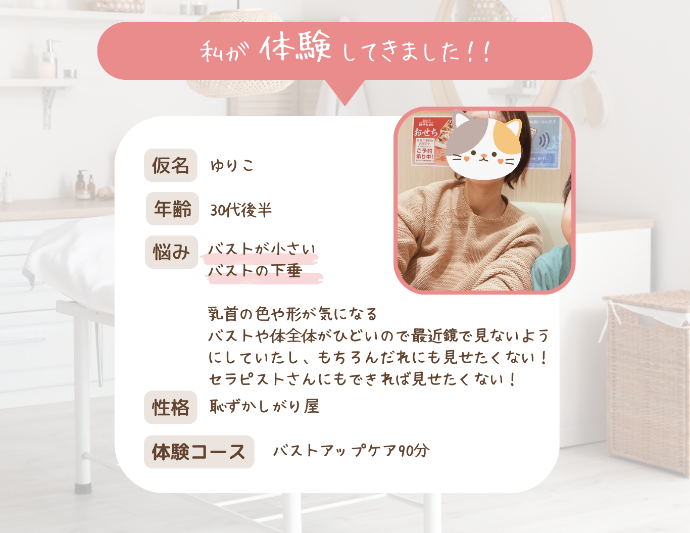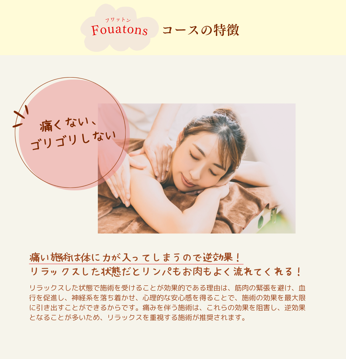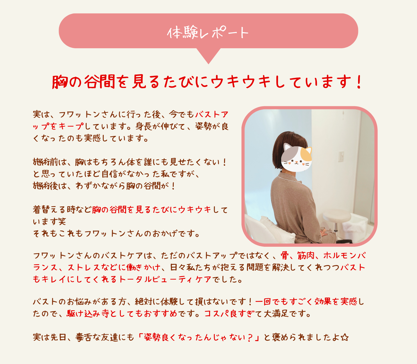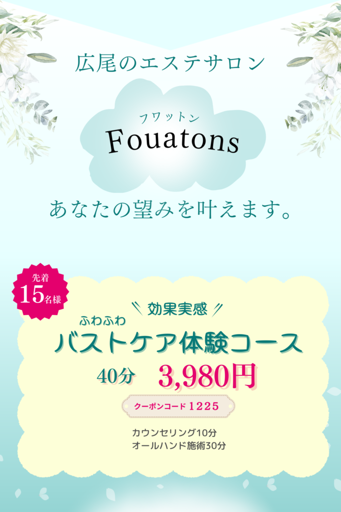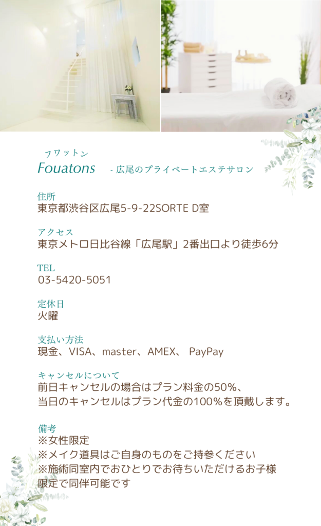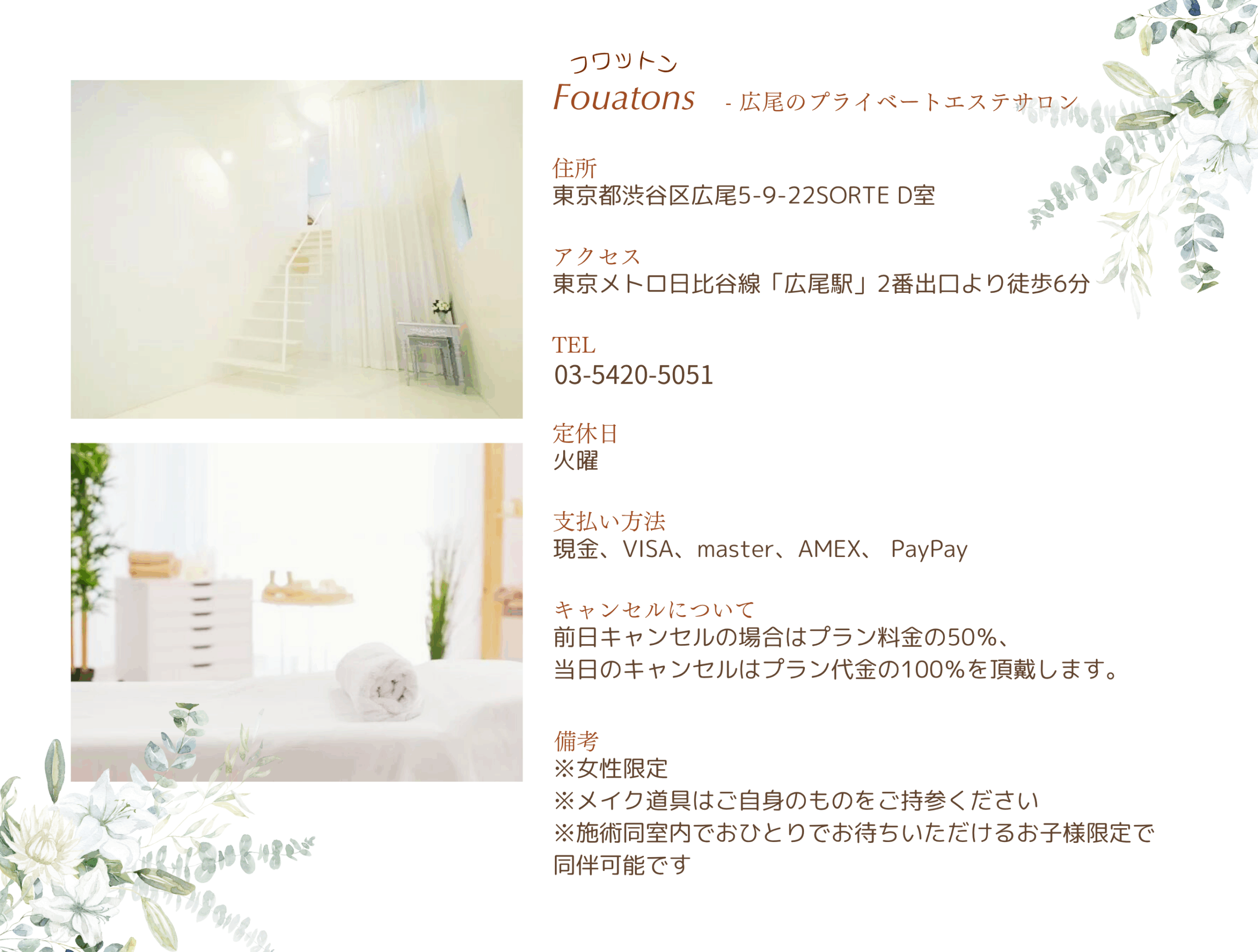なむ2025-05-29Trustindex は、レビューの元のソースが Google であることを確認します。 初めて伺いましたが、担当の方の対応がとても優しく、緊張もすぐほぐれました。 フットバスやマッサージもずっと気持ち良くてかなり癒されました。 バストアップのコースだったので 下着のつけ方なども教わることができ、 勉強になりました。 本日はありがとうございました! Yuki F2025-04-28Trustindex は、レビューの元のソースが Google であることを確認します。 お店に入った瞬間から癒しが始まります。 オーナーの柔らかい笑顔、迎え入れる気配り、そしてお部屋の心地よさ。 施術が始まると、細胞まで届くかの如く丁寧に接してくださる。 全てが期待以上でした。 体が喜ぶのはもちろんのこと、心までほぐれて最高な時間を過ごす事ができました。 次の予約を思うだけでワクワクします。 新しい楽しみが増えました。 本当にプレシャスな時間をありがとうございました。 E I2025-04-27Trustindex は、レビューの元のソースが Google であることを確認します。 とてもリラックスできる空間で、日々の疲れが取れました!!とても丁寧で全ての施術が気持ちよかったです。 Ayako Matsushima2025-04-25Trustindex は、レビューの元のソースが Google であることを確認します。 先日、はじめてオーナーセラピストの京子さんの施術を受けさせていただき、大変感動しました。もちっとして柔らかい、温かな手からの癒しのパワーがとても素晴らしく、すっかり心身共に軽くなり浄化されました。今まで色々なエステを受けさせていただきましたが、ミシュラン級です。フェイスもきゅっと引き上げられ、若かりし頃の柔らかい肌を思い出しました。また、自分へのご褒美に伺いたいと思っております。 さくら2025-04-24Trustindex は、レビューの元のソースが Google であることを確認します。 こちらのお店に入るまで正直不安がありましたが、ここの営業の方はお客側の立場になって親身に話を聞いて下さり、安心して迅速丁寧な対応を常にして下さりました 120分コースで脚のマッサージオプションで アロマの香りと丁寧なマッサージで心身ともに癒されました☘️ 力加減の適切さもバッチリです。 痛気持ちいい部分をがっつり揉んでもらい、ゴリゴリがなくなっていくのが心地よかったです 心も身体が軽くなってポカポカしてウトウトしてました〜 お腹も肩も全身もスッキリです☺️✨ 居心地がいいサロンでした✨ ありがとうございました☺️ rika ogr2025-04-16Trustindex は、レビューの元のソースが Google であることを確認します。 夏が近づいてきたので、バストアップで検索して伺いました。施術の内容も充実していて、話しやすいエステティシャンの方で安心して悩みを相談することができました。 コンプレックスを解消するために、継続して通いたいと思います! mariko miyazaki2025-04-14Trustindex は、レビューの元のソースが Google であることを確認します。 初めてのケアだったので緊張していましたが、とっても親切でお店の空間も素敵でした。自分のご褒美にまた是非行きたいです! junko hotta2025-04-13Trustindex は、レビューの元のソースが Google であることを確認します。 プライベートな空間でとっても癒されました。綺麗な部屋で素敵な時間を過ごすことができました。自分へのご褒美の癒しに定期的に通いたいと思います。 入澤郁2025-04-13Trustindex は、レビューの元のソースが Google であることを確認します。 ホスピタリティがとてもよかったです。良いリフレッシュになりました! midori sasaki2025-04-11Trustindex は、レビューの元のソースが Google であることを確認します。 白を基調とした清潔感あるお部屋で施術をうけました。 スタッフさんはとても優しくマッサージの強さや温かさもちょうど良かったです。 リラックスできるアロマの匂いでとても癒されました。 また来たいと思います。