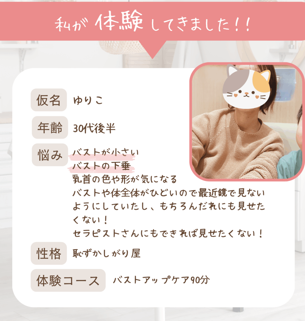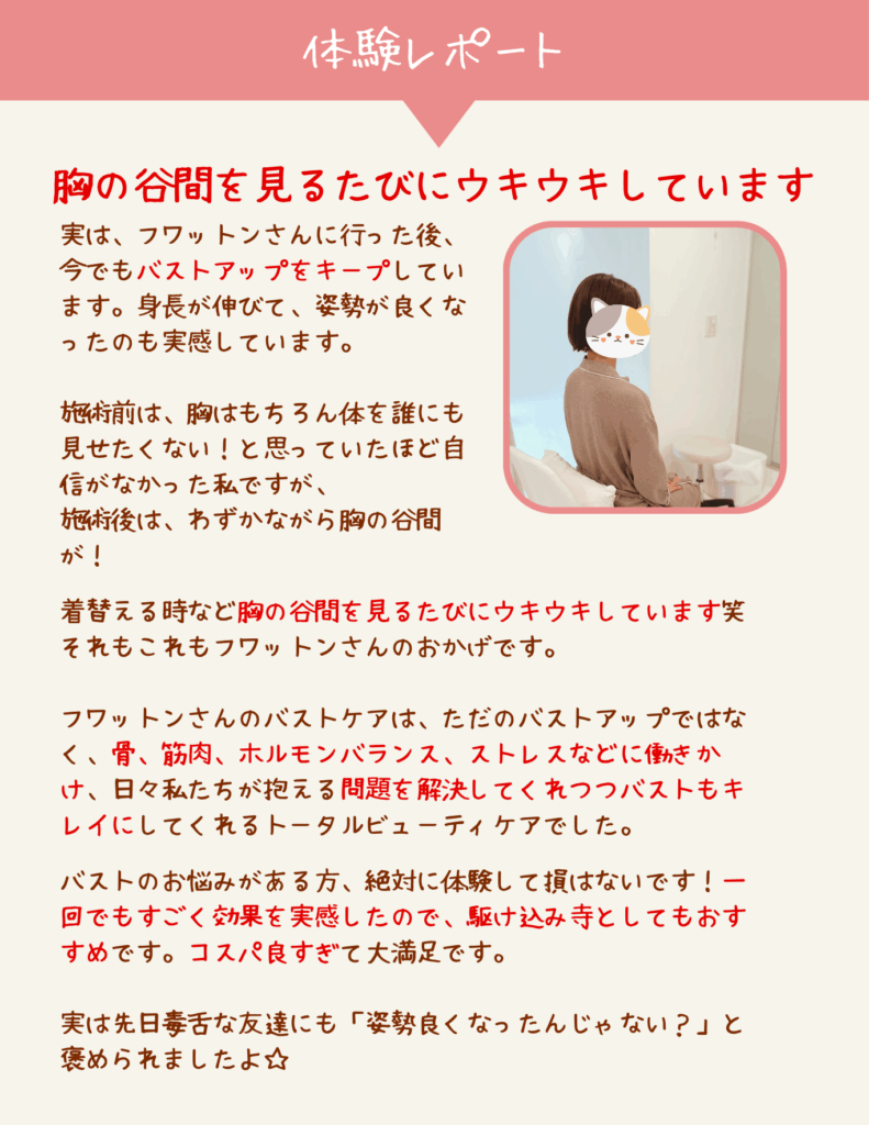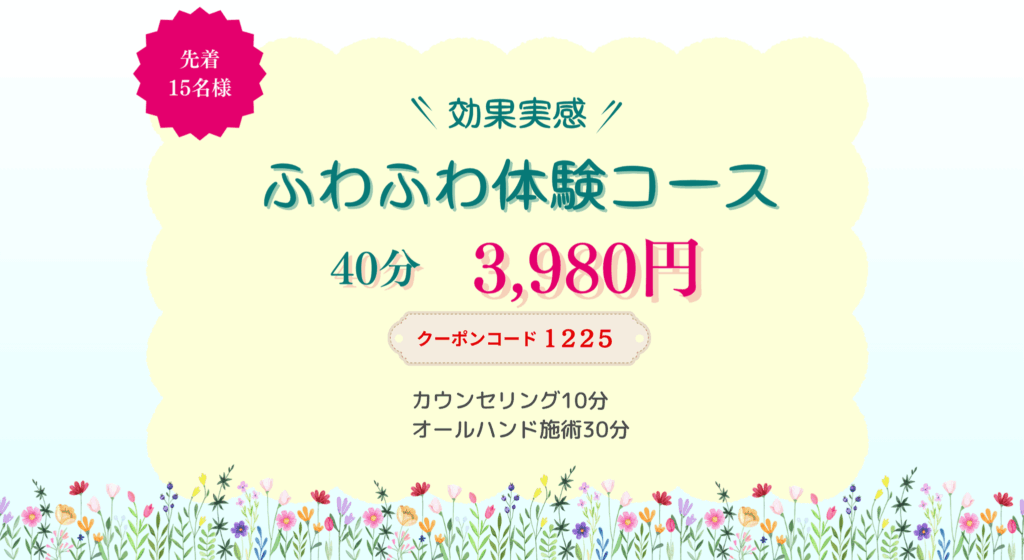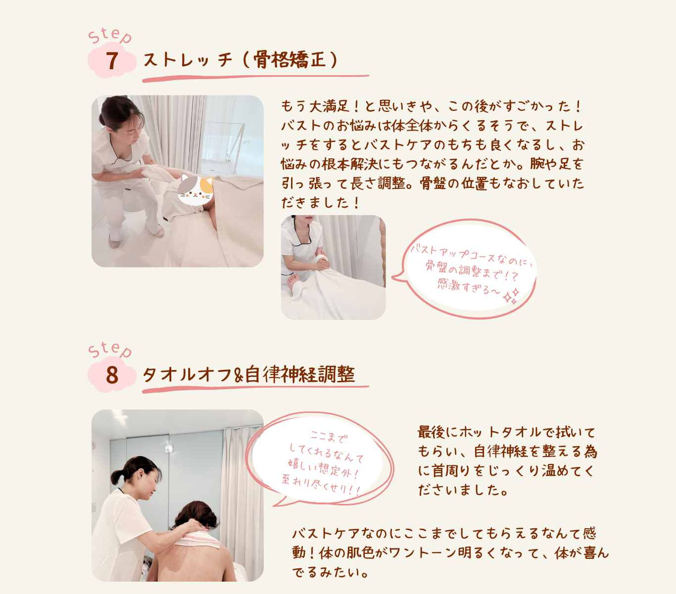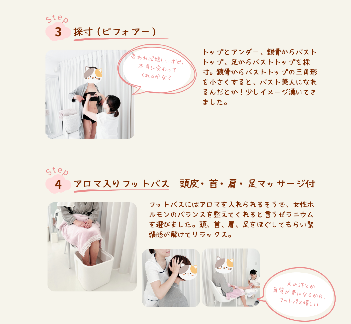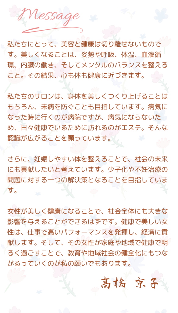 なむ2025-05-29Trustindex は、レビューの元のソースが Google であることを確認します。 初めて伺いましたが、担当の方の対応がとても優しく、緊張もすぐほぐれました。 フットバスやマッサージもずっと気持ち良くてかなり癒されました。 バストアップのコースだったので 下着のつけ方なども教わることができ、 勉強になりました。 本日はありがとうございました! Yuki F2025-04-28Trustindex は、レビューの元のソースが Google であることを確認します。 お店に入った瞬間から癒しが始まります。 オーナーの柔らかい笑顔、迎え入れる気配り、そしてお部屋の心地よさ。 施術が始まると、細胞まで届くかの如く丁寧に接してくださる。 全てが期待以上でした。 体が喜ぶのはもちろんのこと、心までほぐれて最高な時間を過ごす事ができました。 次の予約を思うだけでワクワクします。 新しい楽しみが増えました。 本当にプレシャスな時間をありがとうございました。 E I2025-04-27Trustindex は、レビューの元のソースが Google であることを確認します。 とてもリラックスできる空間で、日々の疲れが取れました!!とても丁寧で全ての施術が気持ちよかったです。 Ayako Matsushima2025-04-25Trustindex は、レビューの元のソースが Google であることを確認します。 先日、はじめてオーナーセラピストの京子さんの施術を受けさせていただき、大変感動しました。もちっとして柔らかい、温かな手からの癒しのパワーがとても素晴らしく、すっかり心身共に軽くなり浄化されました。今まで色々なエステを受けさせていただきましたが、ミシュラン級です。フェイスもきゅっと引き上げられ、若かりし頃の柔らかい肌を思い出しました。また、自分へのご褒美に伺いたいと思っております。 さくら2025-04-24Trustindex は、レビューの元のソースが Google であることを確認します。 こちらのお店に入るまで正直不安がありましたが、ここの営業の方はお客側の立場になって親身に話を聞いて下さり、安心して迅速丁寧な対応を常にして下さりました 120分コースで脚のマッサージオプションで アロマの香りと丁寧なマッサージで心身ともに癒されました☘️ 力加減の適切さもバッチリです。 痛気持ちいい部分をがっつり揉んでもらい、ゴリゴリがなくなっていくのが心地よかったです 心も身体が軽くなってポカポカしてウトウトしてました〜 お腹も肩も全身もスッキリです☺️✨ 居心地がいいサロンでした✨ ありがとうございました☺️ rika ogr2025-04-16Trustindex は、レビューの元のソースが Google であることを確認します。 夏が近づいてきたので、バストアップで検索して伺いました。施術の内容も充実していて、話しやすいエステティシャンの方で安心して悩みを相談することができました。 コンプレックスを解消するために、継続して通いたいと思います! mariko miyazaki2025-04-14Trustindex は、レビューの元のソースが Google であることを確認します。 初めてのケアだったので緊張していましたが、とっても親切でお店の空間も素敵でした。自分のご褒美にまた是非行きたいです! junko hotta2025-04-13Trustindex は、レビューの元のソースが Google であることを確認します。 プライベートな空間でとっても癒されました。綺麗な部屋で素敵な時間を過ごすことができました。自分へのご褒美の癒しに定期的に通いたいと思います。 入澤郁2025-04-13Trustindex は、レビューの元のソースが Google であることを確認します。 ホスピタリティがとてもよかったです。良いリフレッシュになりました! midori sasaki2025-04-11Trustindex は、レビューの元のソースが Google であることを確認します。 白を基調とした清潔感あるお部屋で施術をうけました。 スタッフさんはとても優しくマッサージの強さや温かさもちょうど良かったです。 リラックスできるアロマの匂いでとても癒されました。 また来たいと思います。